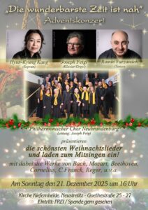 Samstag, 13.12.2025 | 16:30 Uhr | Stadtkirche Neustrelitz J. S. Bach: WEIHNACHTSORATOIRUMKantaten 1–3 Laura Scherwitzl – Sopran Sina Dollinger – Alt Andrés Felipe Orozco – Tenor Sebastian Naglatzki – Bass Singakademie Neustrelitz (gegr. 1840)Mitglieder der Philharmonie Neubrandenburg Lukas Storch – Leitung
